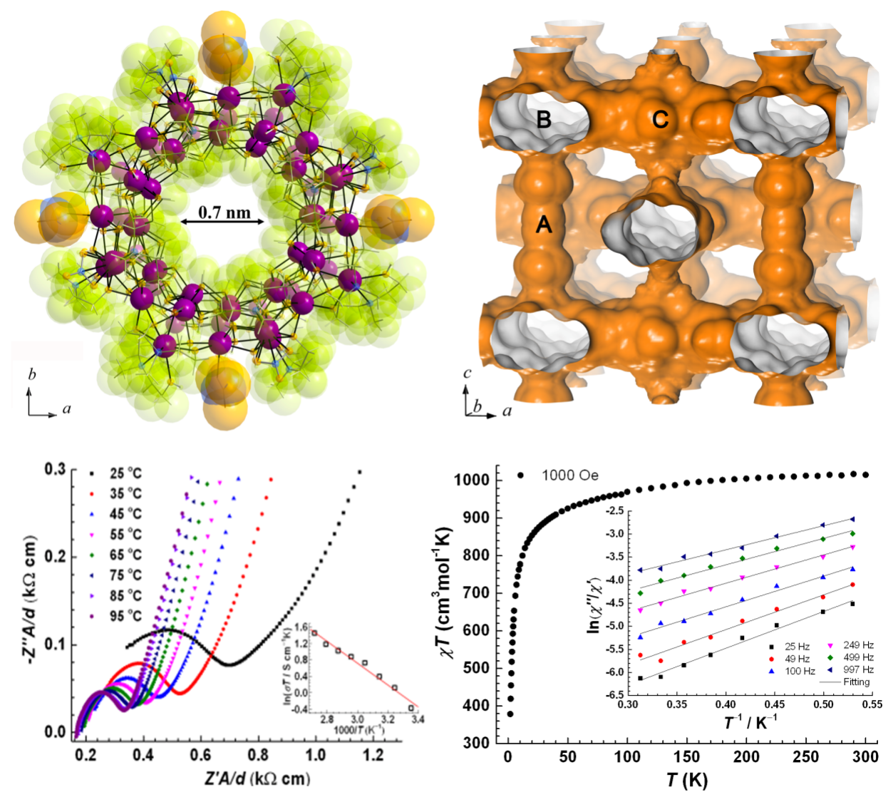 近日,在郑彦臻教授的指导下,bwin博士生秦雷采用配体控制可控水解的方法,在溶剂热条件下成功地制备出第一例稀土基纳米管状分子,该分子具有慢弛豫行为,是目前核数最多的稀土单分子磁体。实验研究表明该分子在高温高湿及常温低湿条件下都具有较高的质子导电率,同时可保持管道结构的稳定性,属于超离子导体,可作为潜在的质子导电材料,用于固体燃料电池及传感器等。