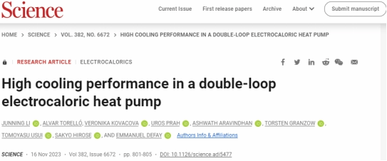 2023年11月16日,卢森堡科学技术研究所Emmanuel Defay教授团队在Science期刊发表题为“High cooling performance in a double-loop electrocaloric heat pump”的电卡制冷技术研究论文,Emmanuel Defay教授为论文通讯作者。论文第一作者为李俊宁博士(硕士毕业于西安交大bwin,导师:娄晓杰教授)。
